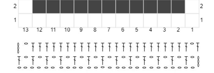 The squares and the blank squares represent stitches, which if written in symbol form would look like this: